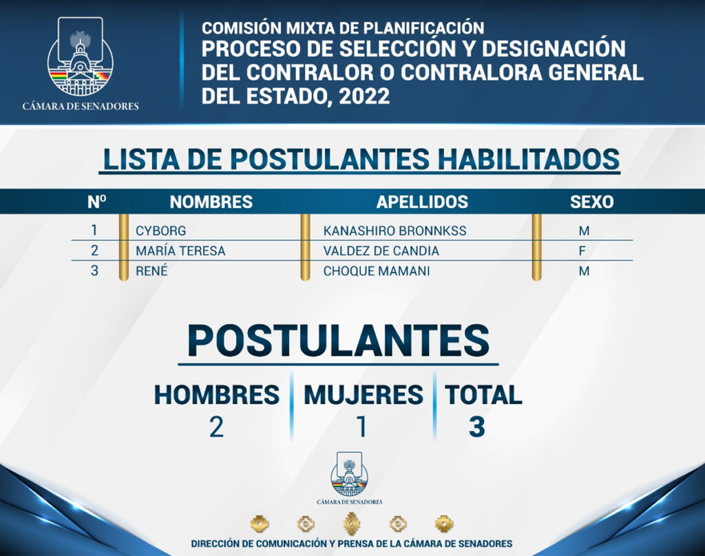 El secretario técnico de la Comisión Mixta de Planificación de la Asamblea Legislativa Plurinacional (ALP), Manuel Córdova, informó ayer miércoles que hasta el momento se registró los tres primeros aspirantes al cargo de Contralor General de Estado.