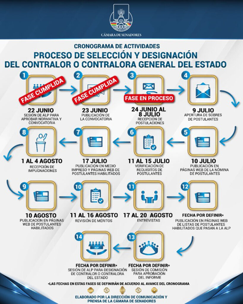 Hasta las 18.00 del viernes 8 de julio y en los horarios previamente establecidos, se atenderá en el Palacio de la Revolución, ubicado sobre la calle Ayacucho, entre Comercio y Potosí, la recepción de documentación de postulaciones a la Contraloría General del Estado.