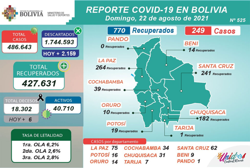 Según el reporte N° 525 de la Dirección Nacional de Epidemiología, el Ministerio de Salud y Deportes informó que este domingo se registró 249 nuevos casos de COVID-19 y 770 pacientes recuperados; es decir, que vencieron a la enfermedad en el país.