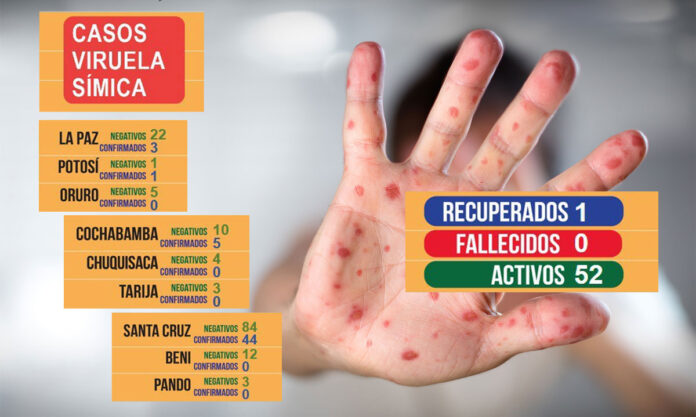 El informe oficial de casos de Viruela del Mono en Bolivia, establece que hasta este miércoles la cifra de contagiados subió a 52 pacientes activos y 1 recuperado. La Paz sumó 2 nuevos casos.