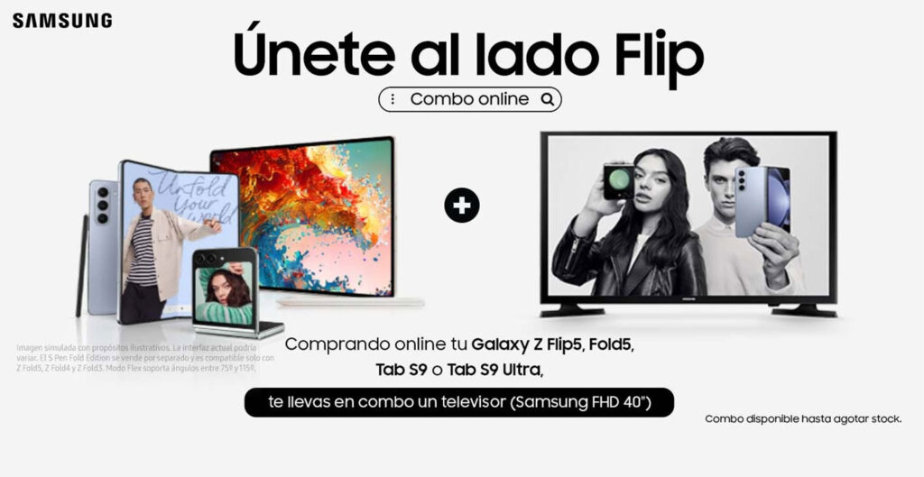 Samsung Bolivia inicia la venta online de su nuevo ecosistema Galaxy, que se compone por la serie Galaxy Z Flip5, Z Fold5 y Galaxy Tab S9, junto a un televisor Samsung FHD de 40”. Los interesados deben ingresar a la página samsung.com.bo/combospreventaonline y seleccionar el pack por el que están interesados. El combo es hasta agotar stock.
