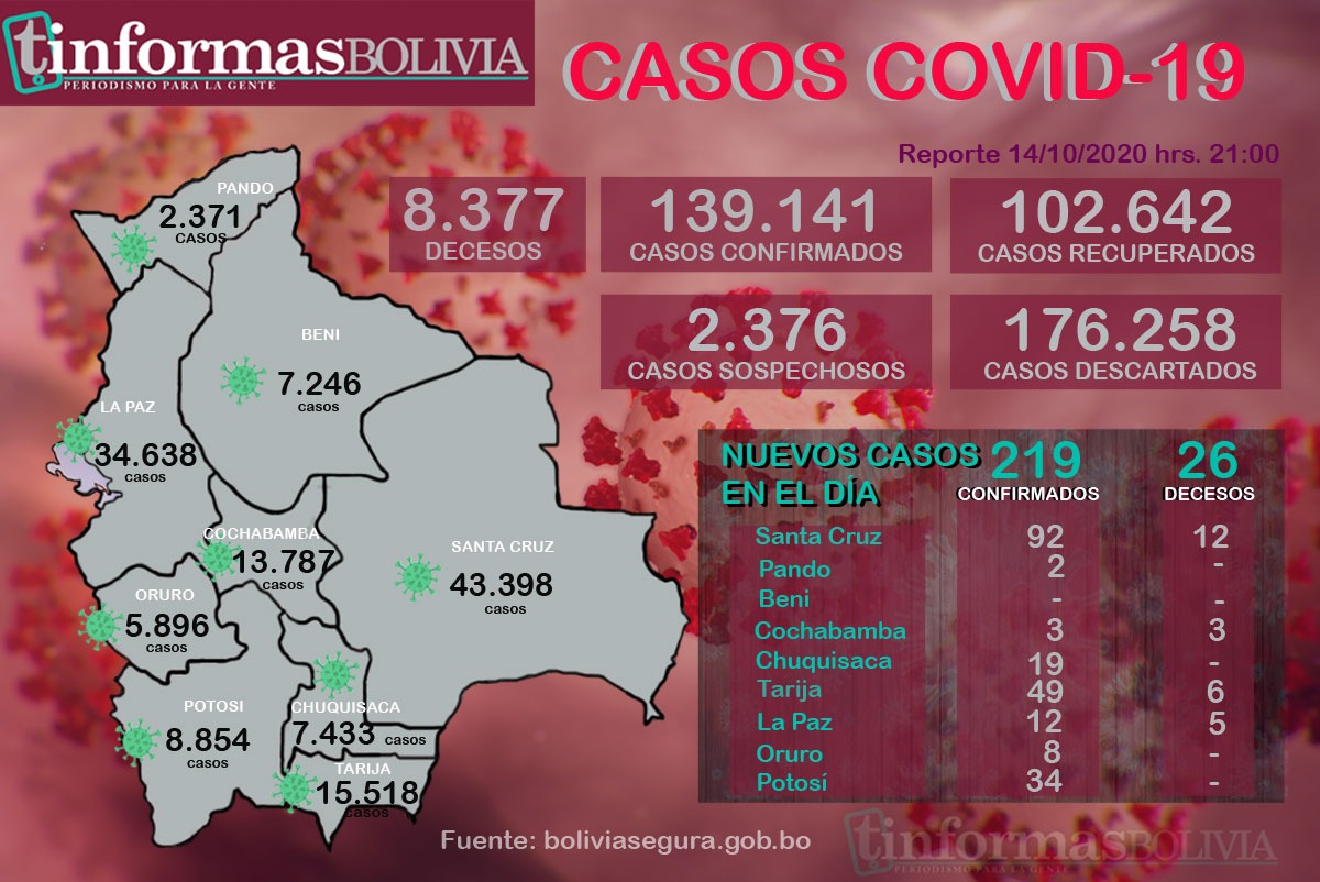 Este miércoles se reportaron 219 nuevos contagios de COVID-19, con los cuales el total sube a 139.141. Después de cinco días, Santa Cruz vuelve a liderar el listado de casos del mal y de las víctimas fatales.