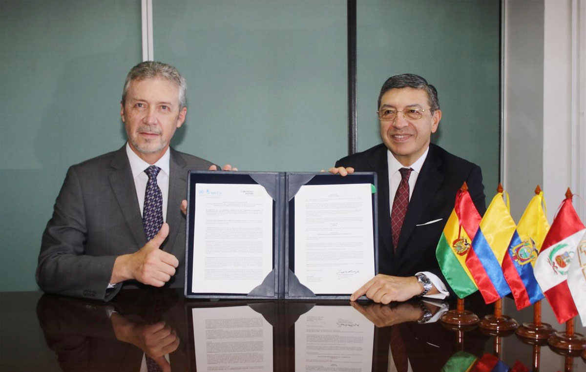 El acuerdo fue firmado por el jefe del organismo, Jorge Hernando Pedraza y el director ejecutivo de UNITAR, Nikhil Seth. Participaron en el acto el viceministro de Servicios del Transporte y Obras Públicas del Ecuador, en representación de la Presidencia Pro Tempore de la CAN, Fernando Arteaga y delegados de Bolivia, Colombia y Perú.