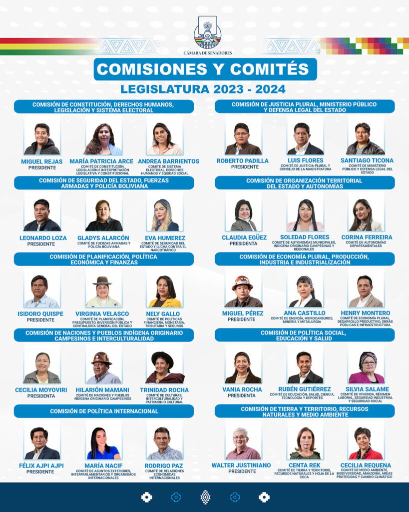 La senadora de CC Cecilia Moyoviri presidirá la Comisión de Naciones y Pueblos Indígena Originario Campesinos e Interculturalidad. La acompañarán el senador del MAS Hilarión Mamani, en el Comité de Naciones y Pueblos Indígena Originario Campesinos y la senadora Trinidad Rocha en el Comité de Culturas, Interculturalidad y Patrimonio Cultural.