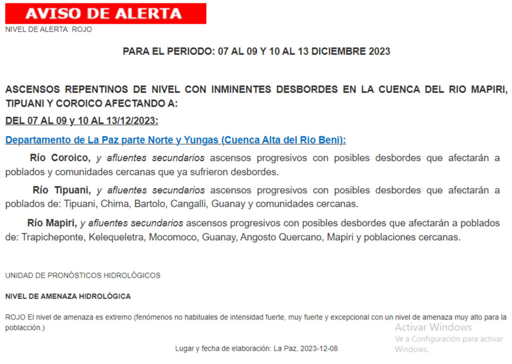 Según el reporte, la alerta, emitida ayer jueves, estará activada hasta el próximo miércoles y advierte de inminentes desbordes en la cuenca del Río Mapiri, Tipuani y Coroico.