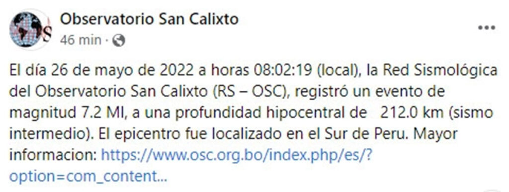 El Observatorio San Calixto confirmó este jueves que el sismo que se sintió en la ciudad de La Paz y también en Cochabamba tuvo como epicentro el sur de Perú con una magnitud de 7.2 y que fue sentido en Chile.