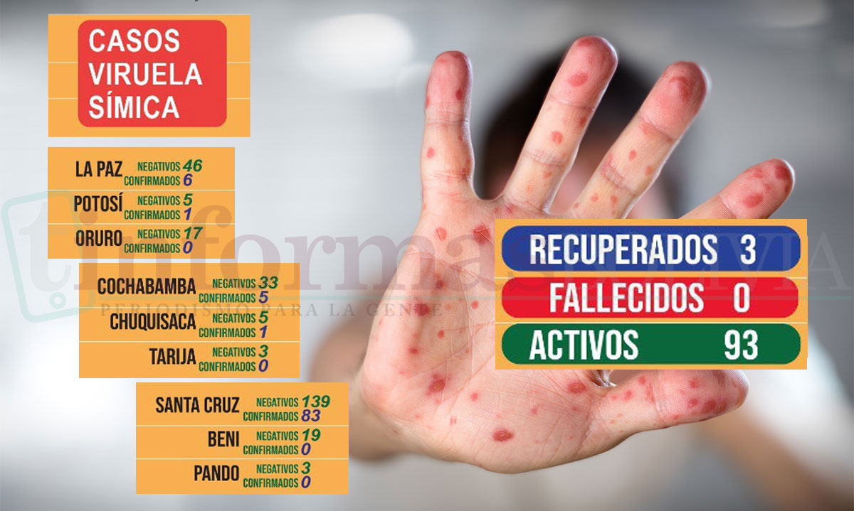 Bolivia registró ayer lunes 3 nuevos casos de Viruela del Mono en el departamento de Santa Cruz que sumarían al total de 93 los pacientes activos, 3 recuperados y 96 el acumulo.