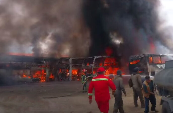 Un voraz incendio de gran magnitud consumió este jueves cinco buses de transporte interdepartamental que se encontraban en un taller mecánico en la zona este de Oruro.