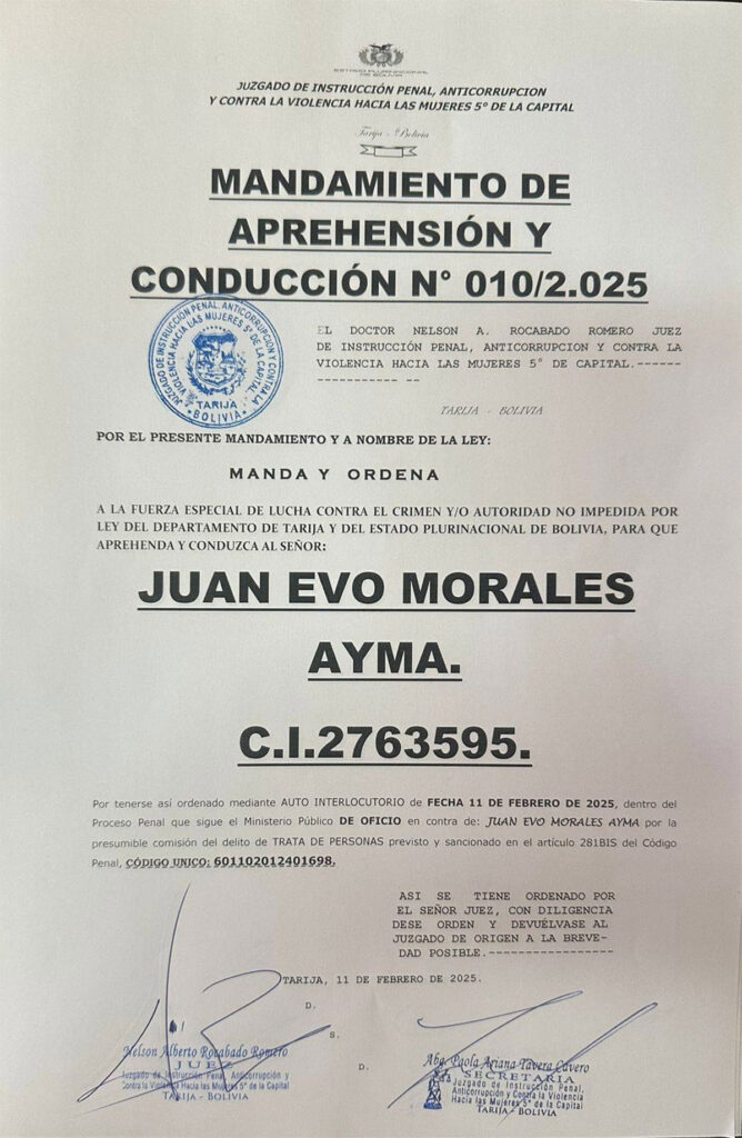 El documento señala que el juez “Manda y Ordena a la Fuerza Especial de Lucha Contra el Crimen y/o Autoridad no impedida por Ley del Departamento de Tarija y del Estado Plurinacional de Bolivia, para que aprehenda y conduzca al señor Juan Evo Morales Ayma».