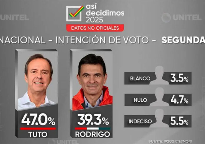 La encuesta de Ipsos–Ciesmori, realizada para la red Unitel, se centra en la segunda vuelta electoral prevista para el 19 de octubre entre Rodrigo Paz y Tuto Quiroga.