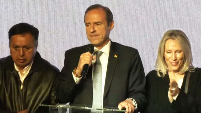 Jorge «Tuto» Quiroga y su compañero de fórmula, Juan Pablo Velasco, de la alianza Libre, reconocieron la noche de este domingo los datos del Sistema de Resultados Preliminares (Sirepre) del Tribunal Supremo Electoral (TSE), que otorgan la victoria en la segunda vuelta presidencial a Rodrigo Paz Pereira y Edmand Lara, del Partido Demócrata Cristiano (PDC). Quiroga llamó personalmente a su rival para transmitirle sus felicitaciones.