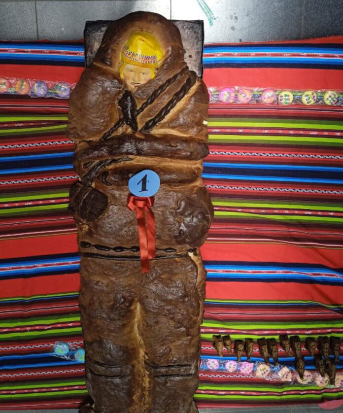 “He decidido realizar un ‘campesinito’. Tiene su poncho, su chuspa, pantalón remangado y una abarca, representa a un difunto varón”, explicó con alegría Apaza, quien se dedica a la panadería desde la infancia.