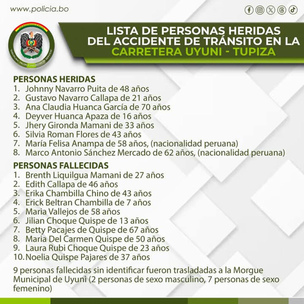 “Una salida de vía con vuelco de tonel nos deja 19 personas fallecidas, de los cuales 2 son menores de edad, 14 mujeres y 3 varones”, explicó en el reporte oficial a los medios locales.